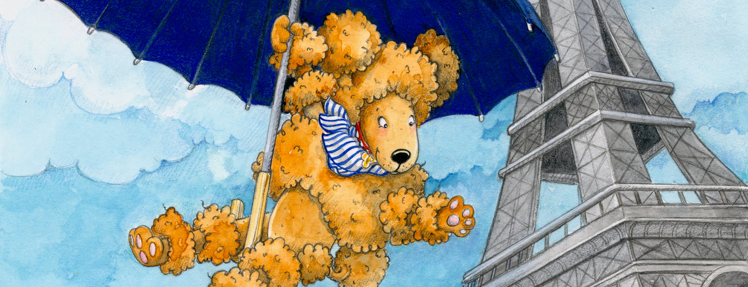 This image: "Paris? He had seen the Eiffel Tower on TV. French Brie was his favourite cheese!" from "Pierre in the Air" By Andrea Beck, published by Orca Books.