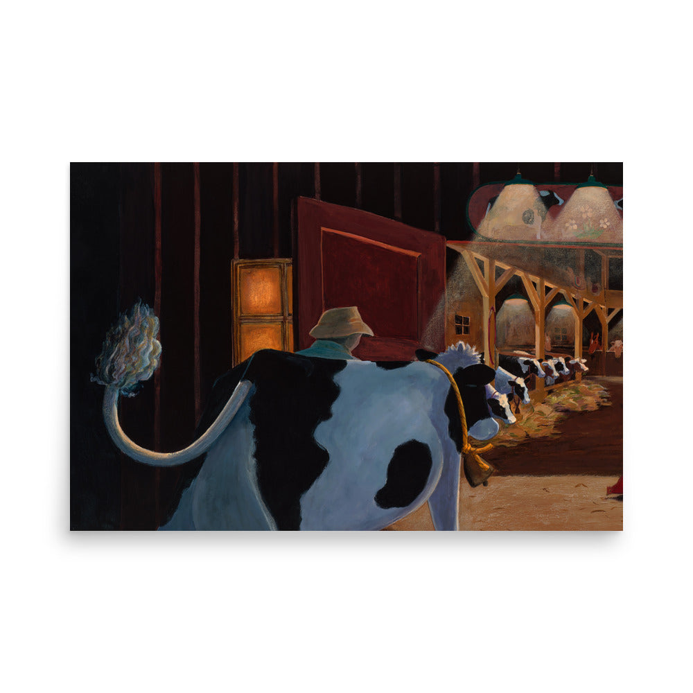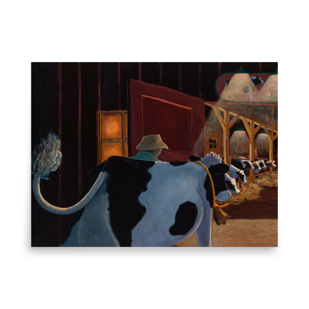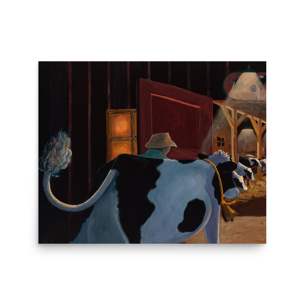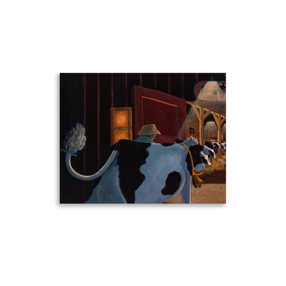 At the end of her lovely day, Buttercup heads back to her friends in the warmly lit barn. This is a beautiful "bedtime" painting that illustrates the comfort of home, family and going to bed for the night.