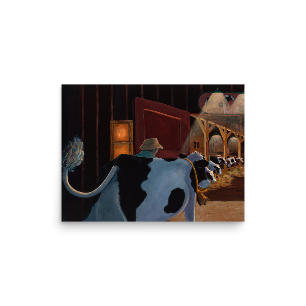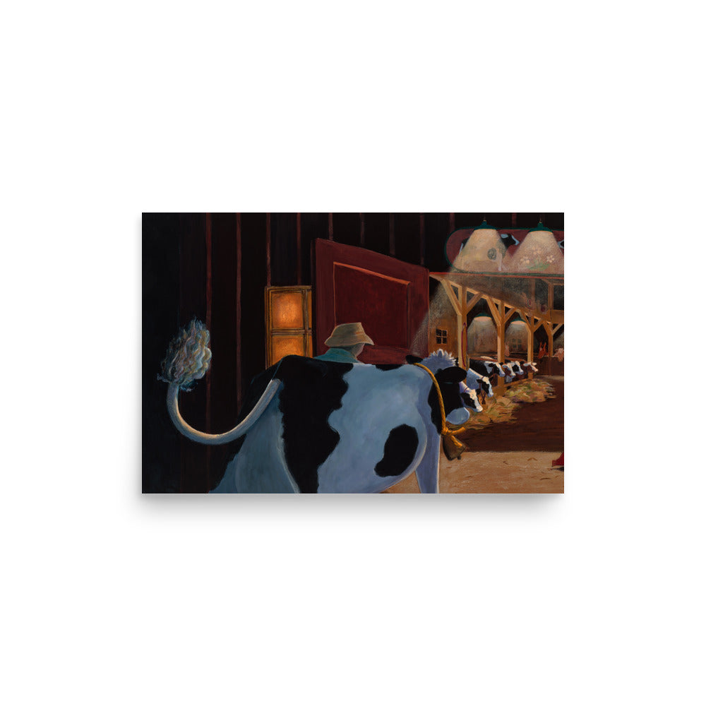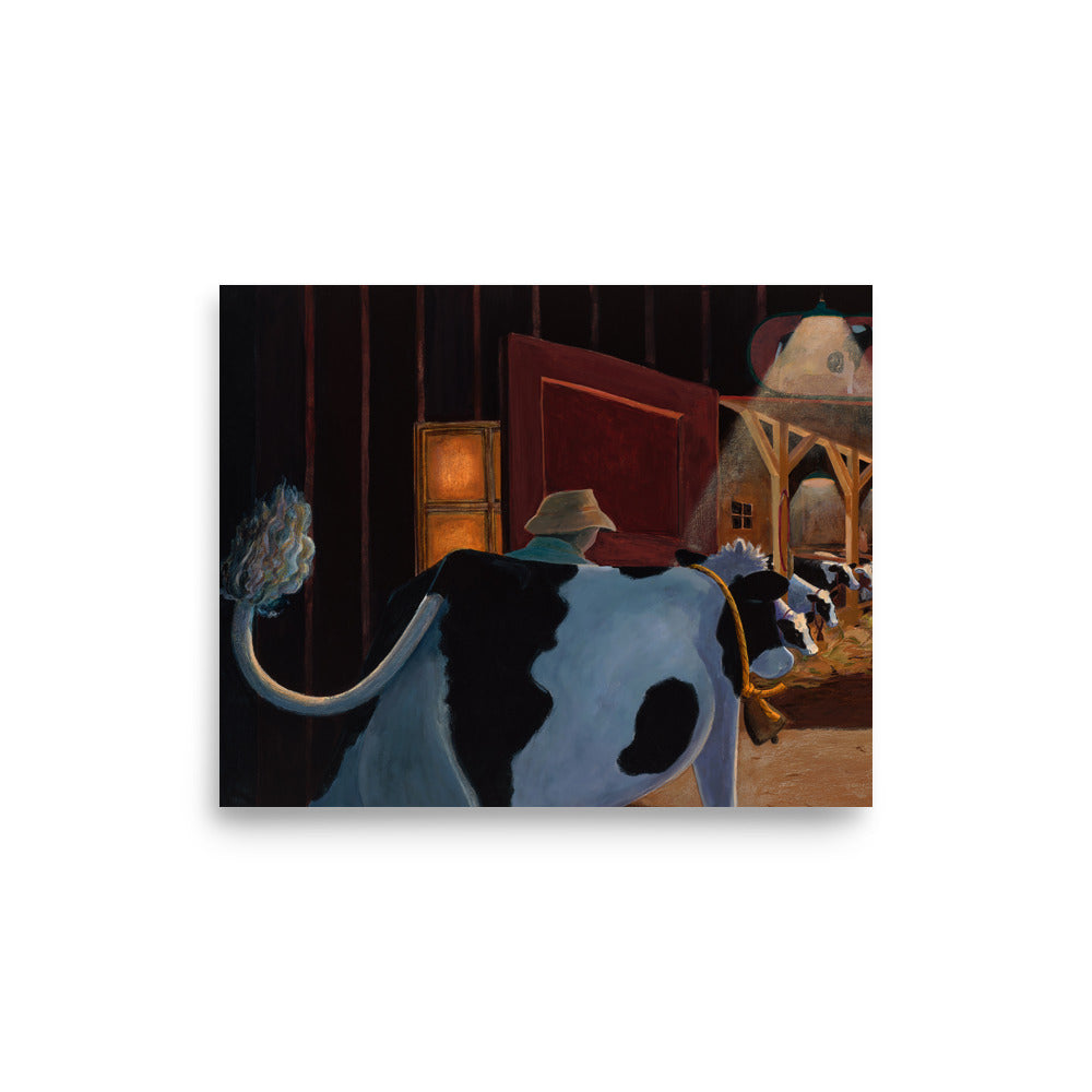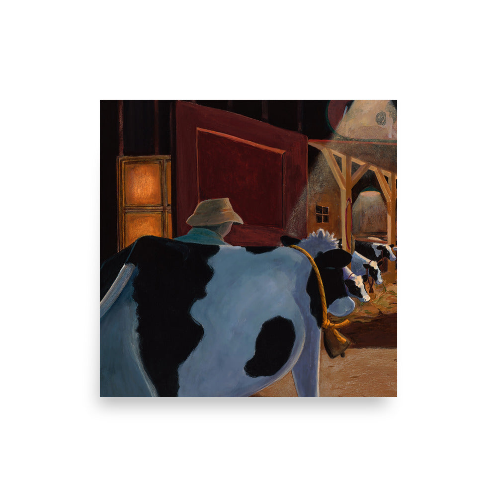At the end of her lovely day, Buttercup heads back to her friends in the warmly lit barn. This is a beautiful "bedtime" painting that illustrates the comfort of home, family and going to bed for the night.