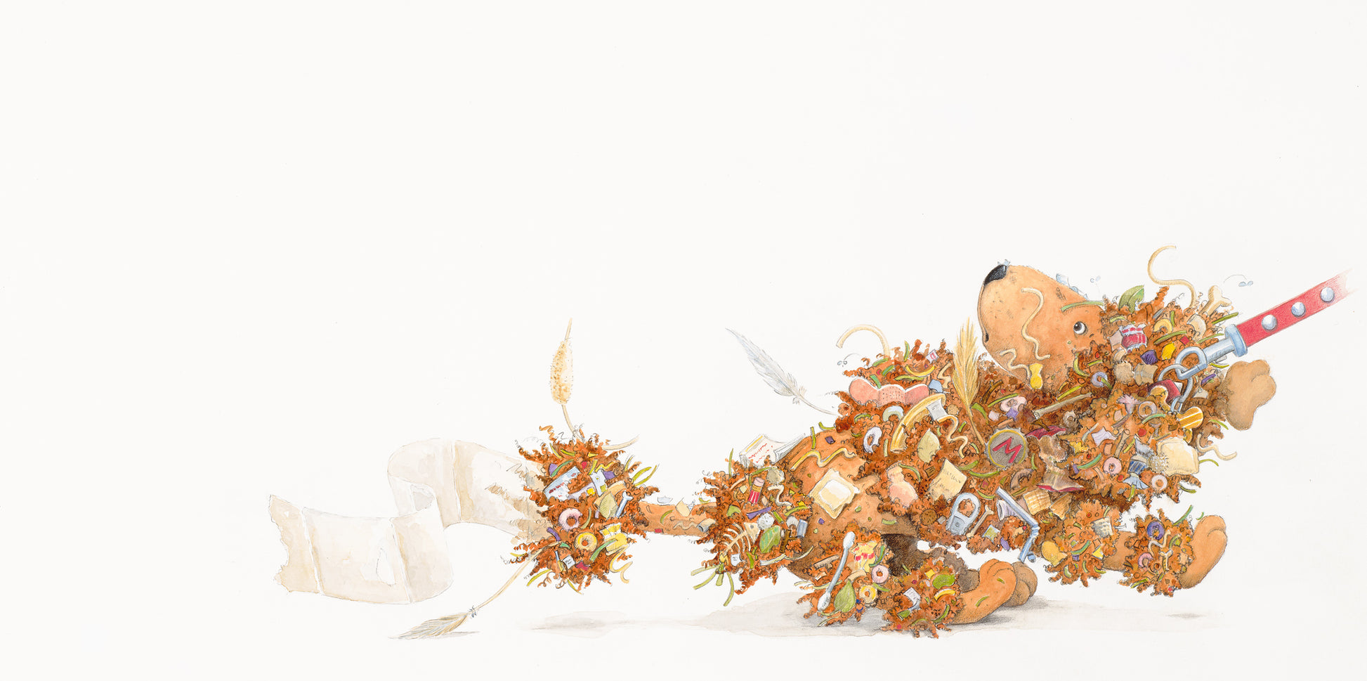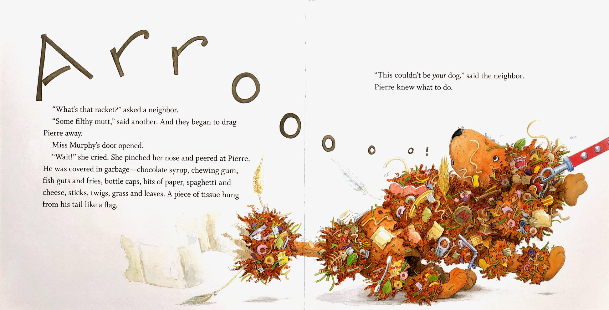 "Wait! she cried. She pinched her nose and peered at Pierre. He was covered in garbage -- chocolate syrup, chewing gum, fish guts and fries, bottle caps, bits of paper, spaghetti and cheese, sticks, twigs, grass and leaves. A piece of tissue hung from his tail like a flag."